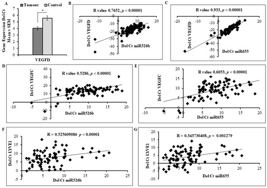 miR526b and miR655 expression is positively correlated with lymphangiogenesis markers in human breast tumours. (A) qRT-PCR analysis of VEGFD mRNA expression in control (adjacent non-tumour) and tumoural tissues. Data are represented as a mean ± SD. (*) indicates significant differences (p < 0.05). (B,C) miR526b and miR655 expression is positively correlated with the VEGFD in primary breast cancer samples; Pearson’s coefficient indicates a very strong positive correlation. (D,E) miR526b and miR655 expression level is positively correlated with another lymphangiogenesis marker VEGFC in primary breast cancer samples. Pearson’s coefficient suggests a positive correlation between the two variables. (F,G) Finally, LYVE1 mRNA expression is positively correlated with miR526b and miR655 expression in tumour samples. Pearson’s coefficient suggests a moderate correlation between the two variables.