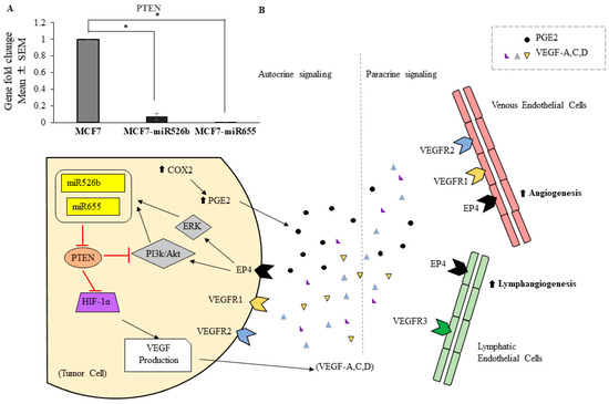 (A) miR526b and miR655 overexpressing cells showing significant down regulation of tumour suppressor gene phosphatase and tensin homolog (PTEN) mRNA expression. Data are represented as mean ± SD.; * (p < 0.05). (B) The proposed pathway of tumour associated angiogenesis and lymphangiogenesis promotion by miR655 and miR526b. miRNA over expressing cells are high in COX-2 expression, resulting in production of PGE2 and its subsequent release into the tumour microenvironment. PGE2 can signal through EP4 in both an autocrine and paracrine fashion. Signalling through EP4 on tumour cells stimulates ERK and PI3k/Akt signalling pathways, resulting in the upregulation of miR526b and miR655. Subsequently, miR526b and miR655 target tumour suppressor gene PTEN. Thus, the inhibitory effect of PTEN on hypoxia-inducible factor-1 (HIF-1a), as well as the PI3K/Akt pathway, is prevented by upregulation of these miRNAs. Without regulation, transcription factor HIF-1a promotes VEGFA, C, D transcription, and thus an overproduction of VEGFs and their subsequent release into the tumour microenvironment for both autocrine and paracrine signalling. VEGF molecules will bind to various VEGF receptor (VEGFR1, VEGFR2) molecules present on vascular endothelial cells (VECs) and lymphatic endothelial cells (LECs) to promote angiogenesis and lymphangiogenesis, respectively. In the absence PTEN’s regulation on PI3k/Akt pathway within the tumour cell, growth and proliferation is promoted.