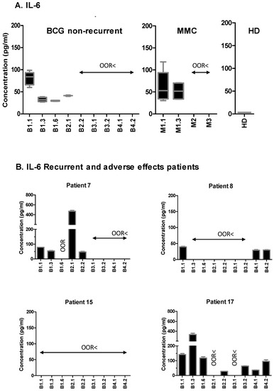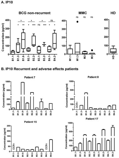 2.3. CXCL10 (IP10) Is Highly Secreted in BCG-Treated NMIBC Patients Seven Days after the Instillations