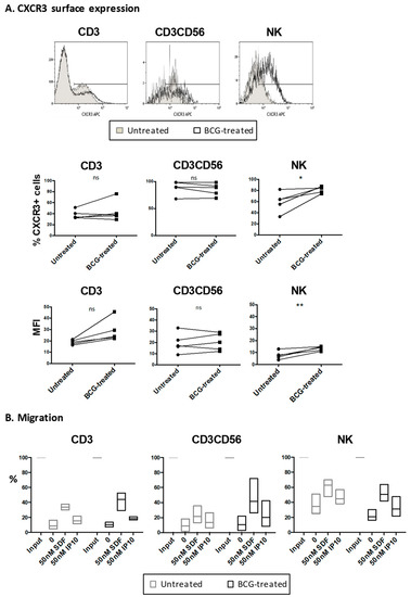 2.5. CXCL10 Does Not Increase the Percentage of Anti-Tumour CD56bright Cells, but Facilitates in the Migration of BCG-Activated Effector Cells