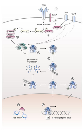 - Yamazaki, T.; Kurosaki, T. Contribution of BCAP to maintenance of mature B cells through c-Rel. Nat. Immunol. 2003, 4, 780–786. [Google Scholar] [CrossRef]