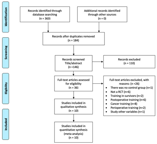 After a comprehensive literature search to identify relevant articles published between 1970 and 2018, 363 titles were initially screened for inclusion, 36 were assessed by full-text review, and 10 were included in the final meta-analysis (Figure 1). The studies included 676 participants (40.5% women), with stage I–IV NCSLC [17]. In addition, nine RCTs [18,19,20,21,22,23,24,25,26] included patients who were also diagnosed with COPD, and one trial [27] contained patients with a confirmed diagnosis of respiratory disease. All patients underwent surgery. The exercise (EG) and control (CG) groups did not differ with respect to preoperative patient characteristics, lung cancer stages (stage I–II: EG, 92%; CG, 93%; stage III–IV [19,20,21]: EG, 8%; CG, 7%), surgical procedures (open surgery: 51%; video-assisted thoracic surgery: 49%), and incidence of respiratory disease (COPD: EG, 54%; CG, 53%). Full details of other characteristics can be found in Table 1.