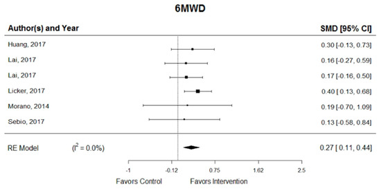 In pooled analyses, the exercise intervention was associated with a significant improvement in 6MWD (SMD = 0.27; 95% CI, 0.11 to 0.44) [18,20,21,24,25,27] and one study showed a statistically significant effect (with the lower bound of the 95% CI > 0) [24]. In addition, homogeneity was substantial among the six RCTs for exercise intervention (I2 = 0.0%) (Figure 2). The symmetry of the funnel plot and a non-significant p-value in the Egger’s test together suggest that there was no significant publication bias (p = 0.970).