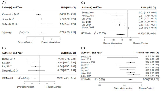 Pooled changes in secondary outcomes: (A) peak of oxygen consumption (VO2peak); (B) dyspnoea; (C) postoperative hospitalization (length of stay), and (D) postoperative pulmonary complications (PPCs). SMD = standardized mean difference; I2 = heterogeneity; RE = random-effects models.