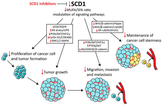 Stearoyl-CoA desaturase 1 (SCD1) as a molecular target for anticancer therapy. SCD1 inhibitors suppress cancer cell proliferation, tumor formation and growth, and cancer cell migration, invasion, metastasis, and stemness. SCD1 regulates these tumorigenic events indirectly through monounsaturated fatty acids (MUFA) synthesis or directly by modulating various signaling pathways (e.g., epidermal growth factor/epidermal growth factor receptor (EGF/EGFR) mitogenic pathway, AKT/GSKβ/β-catenin pathway for stimulation of the epithelial–mesenchymal transition, and Wnt/β-catenin/Hippo pathway for the maintenance of cancer cell stemness). Red arrows indicate the anticancer effect of SCD1 inhibition.