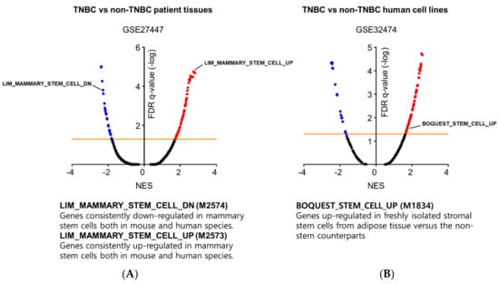 GSEA results showing significant enrichment of stem cell gene sets in (A) TNBC patient tissues and (B) TNBC human cell lines in relation to non-TNBC counterparts. Gene sets are ordered by the normalized enrichment score (NES); the orange line indicates statistical significance (FDR q-value < 0.05).