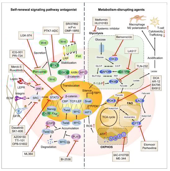 Cancer stem cells (CSCs) possess the ability to survive in diverse microenvironments by obtaining energy from different sources depending on substrate availability. Indeed, accumulating evidence suggests that the preference of CSCs for glycolysis or oxidative phosphorylation (OXPHOS) is context-dependent [112]. Secondary pathways, such as fatty acid oxidation (FAO), serve as alternative strategies for fueling CSCs under additional energy-demanding conditions [112,113]. Moreover, metabolites from CSCs can affect nearby cell populations, such as T cells and macrophages, to help CSCs escape immune surveillance.