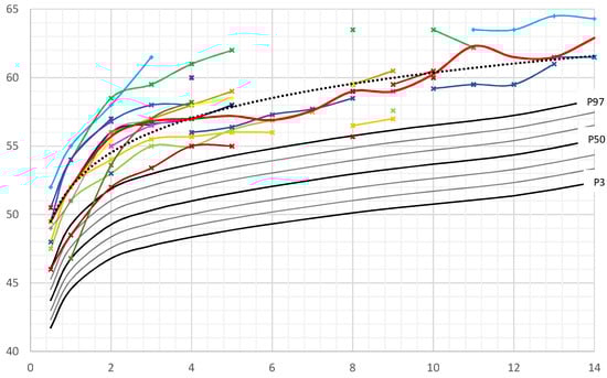 - Tanner, J.M.; Goldsteni, H.; Whitehouse, R.H. Standards for children’s height at ages 2–9 years allowing for heights of parents. Arch. Dis. Child. 1970, 45, 755–762. [Google Scholar] [CrossRef] [PubMed]