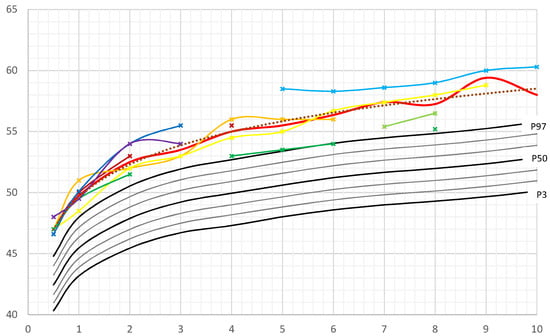 Head circumference (HC) of female PHTS patients in comparison to German reference growth charts [11]. Legend: ___(red): Median, ……: Trendline, ___: P3–P97. Colored lines: individual patient’s HC curves.