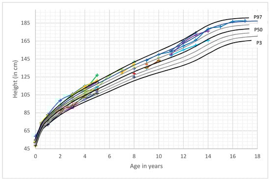 Height development of boys and girls was within the normal range for most time points. All female patients grew within the adequate range for their individually calculated target height. Three out of the 15 boys (20%) demonstrated a growth pattern with a height above their respective familial target height range. All remaining boys (80%) exhibited a growth pattern corresponding to their parent’s heights (Figure 3 and Figure 4).