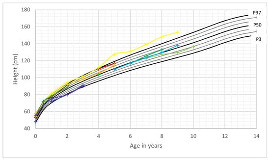 Because of the relatively small number of cases at different timepoints, patient data in growth charts are displayed as complete years. Patient’s age was defined as X years for patients between X ± 0.5 year (e.g., a patient’s age would be defined as 5 years for children aged 4.5 to 5.4 years).