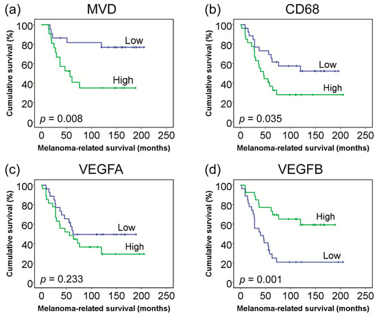 Patient survival in relation to MVD and mRNA gene expression. Groups (high vs. low) were based on the median vessel counts and mRNA gene expression values. (a) Immunohistochemistry (IHC) counts of MVD (n = 43), (b) mRNA gene expression of CD68 macrophages (n = 54), (c) mRNA gene expression of VEGF-A (n = 54), and (d) mRNA gene expression of VEGF-B (n = 54).