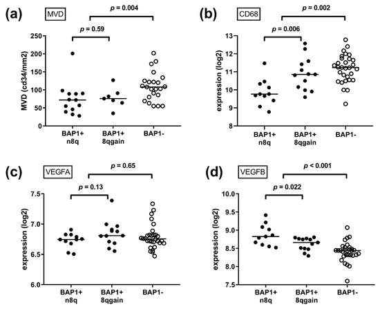 While monosomy 3 (or loss of BAP1) is considered a late event in the development of UM, gain of 8q is an early event [14,15]. When analysing all cases, gain of chromosome 8q was related to an increased MVD (p = 0.029) (Figure 3a), but most tumours with gain of 8q also demonstrated BAP1 loss. When we analysed the relationship of 8q gain within tumours that still expressed BAP1 (n = 20), 8q gain was not related to MVD (p = 0.59) (Figure 2). As only two of the BAP1-negative tumours demonstrated normal 8q, we cannot conclude on the effect of 8q gain within BAP1-negative lesions.