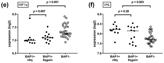Tumour genetics in relation to MVD and mRNA gene expression. Gain of chromosome 8q is an early event in UM development, while loss of BAP1 is a later event. (a) IHC counts of MVD (n = 43), (b) mRNA gene expression of CD68 macrophages (n = 54), (c) mRNA gene expression of VEGF-A (n = 54), (d) mRNA gene expression of VEGF-B (n = 54), (e) mRNA gene expression of HIF1a (n = 54), and (f) mRNA gene expression of VHL (n = 54). (p-values were obtained using Mann–Whitney U tests, comparing BAP1+ and n8q with BAP1+ and 8qgain patients, and all BAP1+ with all BAP1− patients. Abbreviations: BAP1+, BAP1-positive; BAP1−, BAP1-negative; n8q, normal chromosome 8q; 8qgain, gain of chromosome 8q).