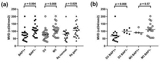 Tumour genetics in relation to MVD. (a) Within all 43 patients, patients were compared based on status of BAP1, chromosome 3 or chromosome 8q. (b) Within either disomy 3 (n = 22) or monosomy 3 (n = 21) patients, patients were compared based on status of BAP1. (p-values were obtained using Mann–Whitney U tests. Abbreviations: BAP1+, BAP1-positive; BAP1−, BAP1-negative; D3, Disomy 3; M3, Monosomy 3; 8q normal, normal chromosome 8q; 8q gain, gain of chromosome 8q).