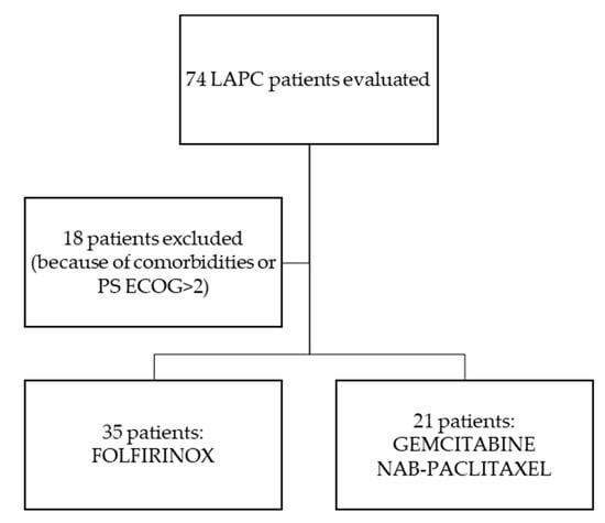 Patients, at least 18 years of age, which came to our Department of Oncology, at “Federico II” University of Naples with cytologically or histologically confirmed pancreatic ductal adenocarcinoma (PDAC), who had been evaluated as LAPC, while using NCCN guidelines as reference, with no evidence of metastatic disease, malignant ascites, or pleural effusion, were retrospectively evaluated and included in the analysis.