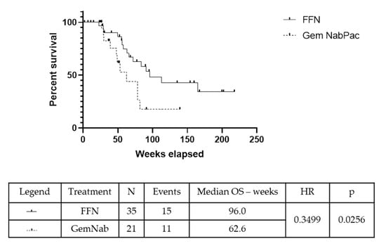The median duration of follow up was 12.8 months. The number of patients undergoing surgery was 14/35 with FFN (40%) and 6/21 with GemNab (28.6%) (p = 0.565). The R0 resection rate was 10/14 (71.43%) in the FFN group and 5/6 (83.3%) in GemNab group (p = 0.87). The remaining five patients obtained R1 resections (four in the FFN group, one in the GemNab); no R2 resections were registered. The value of the Carbohydrate Antigen 19.9 (CA19.9) after neoadjuvant therapy was evaluated to find correlation with the status of margins at resection. In the FFN group: one patient had an increase in CA19.9 value of 125%, obtaining a R0 resection; one patient had a decrease in the CA19.9 value of less than 50%, with an R1 resection; the remaining 12 had a decrease in the CA19.9 value 50–100% of the baseline value, with three R1 resections and nine R0s. In the group of patients resected after GemNab: one patient had an increase of almost 300% of the baseline value of CA19.9 and underwent resection, with positive margins; one patient had a reduction of 0–50% of the CA19.9 value and obtained a R0 resection; two patients had a CA19.9 reduction of 50–100% with both obtaining R0 resections. We have not obtained information regarding the CA19.9 after NACT before surgery in two patients. Statistical analysis was not performed because of the small sizes of the subgroups. The median Overall Survival (mOS) in the overall population was 96 weeks in the FFN group and 62.6 weeks in the GemNab group (p = 0.026, 95% CI 0.14–0.88; HR = 0.35) (Figure 2).