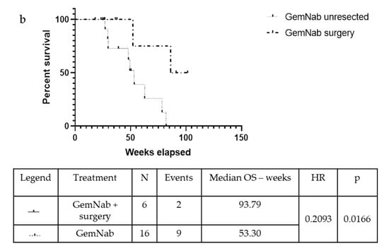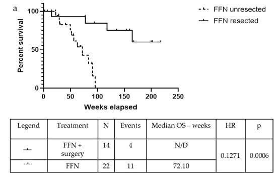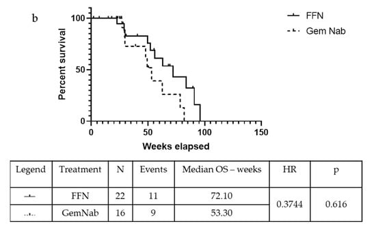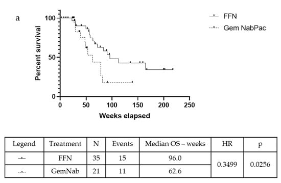 The median Disease-Free Survival (DFS) was 77.10 weeks in the FFN group and 58.65 weeks in the GemNab group in the population undergoing surgery (p = 0.625). Meanwhile, the mOS is yet to be reached in the FFN group and it is 93.79 weeks in the GemNab patients; moreover, analysing the difference in overall survival between unresected and resected patients is statistically significant, both in the FFN (p = 0.0006; Figure 4a) and in the GemNab group (p = 0.0166; Figure 4b). A longer follow up is still needed in the population undergoing surgery.