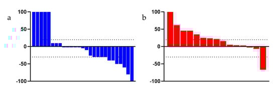 Waterfall Plot evaluating the objective responses of patients, (a) treated with FFN and (b) treated with GemNab. The dotted bar indicates +20% and −30%, range for stable disease, as per RECIST criteria.