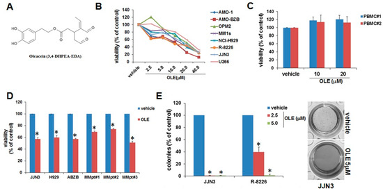 Effects of oleacein on multiple myeloma (MM) cell survival. (A) Chemical structure of oleacein. (B) Cell viability of MM cell lines as determined by Cell Titer Glo (CTG) assay 48 h after treatment with increasing doses of oleacein or vehicle (DMSO). (C) CTG assay performed on peripheral blood mononuclear cells (PBMCs) from three different healthy donors treated with oleacein for 48 h. (D) CTG assay in MM cell lines and primary CD138+ cells from three MM patients (MM pt#1, #2 and#3) co-cultured on HS-5 stromal cells and treated for 48 h with 5.0μM oleacein. (E) Colony formation assay performed on MM cell lines treated for 14 days with oleacein; representative pictures of JJN3 colonies at day 14 are shown in the right panel (5× magnification). * p < 0.05 as compared to vehicle-treated cells.