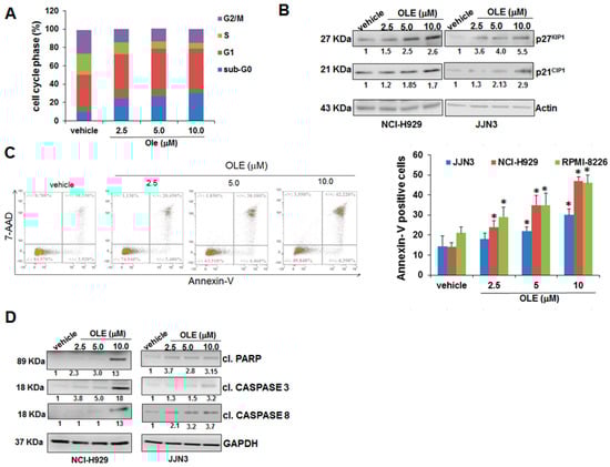 Oleacein triggers cell cycle blockade and apoptosis. (A) Cell cycle analysis was performed on NCI-H929 cells by PI staining, 24 h after treatment with oleacein or vehicle (DMSO). (B)Western Blot (WB) analysis of p27KIP1 and p21CIP1 in whole cell lysates from MM cells after treatment with oleacein for 24 h; actin was used as loading control. (C) Annexin V/7-AAD staining of MM cells after treatment with oleacein for 48 h; a representative experiment on NCI-H929 cells is shown on the left side. (D) WB of PARP1, cleaved caspase-3 and cleaved caspase-8 in NCI-H929 and JJN3 cell lines after 24 h of oleacein treatment; GAPDH was used as loading control. * p < 0.05 as compared to vehicle-treated cells.