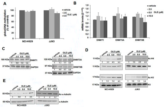Aberrant epigenetic patterns are common in MM, where they are frequently associated with disease onset and/or progression to advanced stages [12,13,14]. A large body of literature has highlighted the capability of several natural compounds to revert the altered epigenome of MM cells by counteracting key oncogenic epigenetic regulators [2]. On this basis, we investigated the epigenetic impact of oleacein on MM cells, by analyzing its effects both on global DNA methylation (GDM) and histone acetylation, the two major epigenetic mechanisms dysregulated in MM. Oleacein did not significantly modify the whole content of methylated cytosines in DNA from NCI-H929 and JJN3 cell lines (Figure 3A); in line with the latter finding, no significant changes in mRNA or protein levels of DNA methyltransferases (DNMT1, DNMT3A and DNMT3B) were observed upon oleacein treatment, as shown by QRT-PCR (Figure 3B) and WB analyses (Figure 3C). Conversely, oleacein induced a significant increase in acetylated histone H3, histone H4 (Figure 3D) and α-tubulin (Figure 3E). Collectively, these findings suggest that oleacein is able to modulate the acetylome of MM cells.