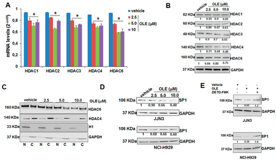 Oleacein targets HDACs. QRT-PCR (A) and WB analysis (B) of HDAC1, HDAC2, HDAC3, HDAC4, HDAC6 in JJN3 cells treated with oleacein for 24 h; GAPDH was used as loading control. (C) WB analysis of HDAC4 and HDAC6 in nuclear (N) and cytoplasmic (C) protein fractions from JJN3 cells treated for 24 h with oleacein; histone H1 and GAPDH were used as nuclear and cytoplasmic marker, respectively. (D) WB analysis of Sp1 in JJN3 cells treated with oleacein for 24 h. (E) WB analysis of Sp1 in JJN3 cells treated with 5.0 µM oleacein with or without 20.0 µM Z-ITED-FMK; GAPDH was used as loading control. * p < 0.05 as compared to vehicle-treated cells.