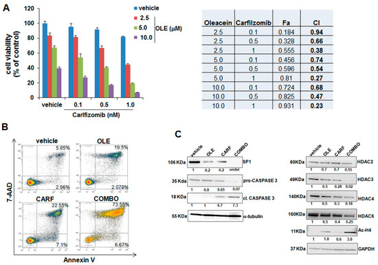 Oleacein enhances the anti-MM activity of carfilzomib. (A) CTG assay was performed on NCI-H929 cells treated with oleacein (2.5, 5.0 or 10.0 µM) and carfilzomib (0.1, 0.5 and 1.0 nM). Results are expressed as percentage of the viability of vehicle-treated cells. The right panel reports values of fraction affected (Fa) and combination indexes (CI) in a triplicate experiment, as calculated by the Calcusyn software. (B) Annexin V/7-AAD staining of NCI-H929 cells after treatment with vehicle (DMSO), 5.0 µM oleacein and 1.0 nM carfilzomib for 24 h; a representative FACS experiment is reported. (C). WB analysis of pro-Caspase 3, cleaved caspase 3, SP1, HDAC2, HDAC3, HDAC4, HDAC6, and acetylated histone H4 in NCI-H929 cells treated with carfilzomib (1.0 nM), oleacein (5.0 µM) or a combination of the two; α-tubulin or GAPDH were used as loading controls.