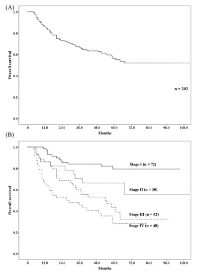 Overall survival rate of patients with esophageal cancer received proton beam therapy. (A) Overall survival rate for all patients. (B) Overall survival rate for each stage.