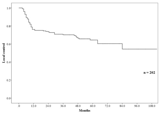 A higher rate for localized recurrence is a major problem in definitive radiotherapy for esophageal cancer and is observed in 34–46% of patients with locally advanced esophageal cancer in a previous study [5,8]. The rate of LC observed in our study was slightly higher than or equal to that of previous studies even after including patients with stage IV esophageal cancer, which could be attributed to the higher total dose used in this study. Some reports have shown a correlation between LC and increased dose [26,27,28]. Suh et al. have reported that patients receiving CRT and a total dose > 60 Gy had a better LC [26]. In a separate study, Zhang et al. have shown that significantly higher rates of LC and OS were observed in patients receiving a dose > 51 Gy [27]. A meta-analysis on preoperative CRT for the treatment of esophageal cancer has indicated that a higher dose was correlated to a higher pathological complete response [28]. Local recurrence of esophageal cancer can decrease a patient’s quality of life; therefore, an increase in dose using PBT may be useful in improving LC particularly in patients with inoperable esophageal cancer.