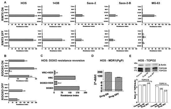 Acquired in-vitro resistance to methotrexate (MTX) and doxorubicin (DOXO) in osteosarcoma cell lines and cross-resistance with other chemotherapeutic agents used in osteosarcoma. Resistance Index (RI) is defined as the ratio IC50 of resistant line/IC50 of the corresponding parental line. IC50 - Half-maximal inhibitory concentration. (A) RI of MTX and cross-resistance to other drugs used in osteosarcoma (doxorubicin, methotrexate, etoposide, cisplatin, mafosfamide, and cabozantinib) for the MTX resistant lines (R/MTX)—Drug-ON and Drug OFF (at 9 weeks); (B) RI of DOXO and cross-resistance to other drugs used in osteosarcoma (doxorubicin, methotrexate, etoposide, cisplatin, mafosfamide, cabozantinib, and vincristine) for the DOXO resistant lines (HOS-R/DOXO)— Drug-ON and Drug OFF (at nine weeks). Vincristine was also used to treat the resistant line Drug-ON; (C) resistance reversion by P-glycoprotein (PgP) inhibitors in HOS-R/DOXO with the PgP inhibitor Verapamil (VER); (D) Multidrug resistance polypeptide 1 (MDR1/ABCB1 or PgP) mRNA expression in HOS-R/DOXO Drug-ON and Drug-OFF by RT-qPCR (reverse transcription– quantitative polymerase chain reaction) compared to the parental line equal to expression level of 1; (E) topoisomerase IIa (TOPO2A) and IIb (TOPO2B) mRNA expression in HOS-parental, HOS-R/DOXO Drug-ON and Drug-OFF by Western blot (WB bands and the Ratio DHFR/Actin represented by the Y axis and the Ratio Resistant/Parental DHFR expression values showed above corresponding column);. ND—Not done; R—Resistant; ETOP—Etoposide; CISP—Cisplatin; MAF—Mafosfamide; VCR—Vincristine. p < 0.05 was considered statistically significant (the values presented in the Figure 1A,B were considered statistically significant).