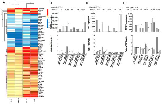 Differential analysis of the MTX-resistant and parental cell lines. (A) Heatmap illustrating color-coded expression levels of the most differentially expressed genes from RNA sequencing of MTX-resistant Drug-OFF versus parental cell lines; (B) dihydrofolate reductase (DHFR) modification in MTX-resistant compared to parental cell lines at Copy Number Abnormalities (CNA) obtained by aCGH, mRNA expression (RNA sequencing), and protein level (Western blot—Ratio DHFR/Actin represented by the Y axis and the Ratio Resistant/Parental DHFR expression values showed above corresponding column); (C) reduced folate carrier (RFC/SLC19A1) modification in MTX-resistant compared to parental cell lines at Copy Number Abnormalities (CNA; aCGH), mRNA expression (RNA sequencing), and protein level (Western blot); (D) methylenetetrahydrofolate reductase (MTHFR) modification in MTX-resistant compared to parental cell lines for Copy Number Abnormalities (CNA; aCGH), mRNA expression (RNA sequencing), and at protein level (Western blot).