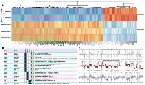 Differential analysis of the DOXO-resistant and parental cell lines. (A) Heatmap illustrating color-coded expression levels of the most differentially expressed genes from RNA sequencing of HOS-R/DOXO Drug-OFF (n = 3) versus parental cell line (n = 2); (B) genes found significantly enriched for specific chromosomal regions (cytobands); (C) direct comparison of HOS-R/DOXO versus HOS-parental CNA profiles. Upper panel: unscaled CNA profiles for HOS-R/DOXO (blue) and HOS-parental (green). Middle panel: same profiles after dynamics scaling of the HOS-parental profile, with significant differences colored in red areas, with corresponding segment positions as blue or red bars. Lower panel: segmentation of the difference profile.
