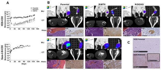 Bone engraftment rates of HOS-R/MTX and parental counterpart were maximal (100%), whereas the HOS-R/DOXO-CDX had a slightly lower engraftment rate (66%) (Table 1).