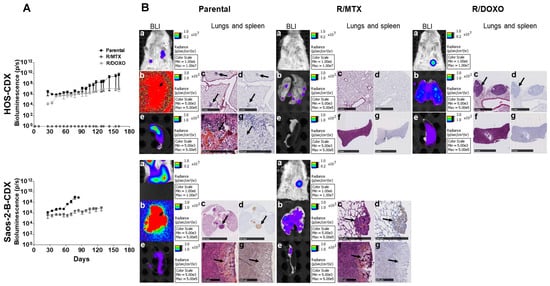 In-vivo metastatic behavior of the bioluminescent parental and resistant orthotopic cell-derived-xenografts osteosarcoma models in NSG mice by intratibial injection. HOS-CDX (top panel), Saos-2-B-CDX (bottom panel). (A) In-vivo bioluminescence (BLI) detection of parental and resistant-CDX metastases overtime; (B) CDX-models at sacrifice time: HOS- and Saos-2-B-parental-CDX, HOS- and Saos-2-B-R/MTX-CDX and HOS-R/DOXO-CDX. in-vivo (a) and ex-vivo BLI of lung (b) and spleen (e) metastases. Lung Hematoxylin Eosin Safranin (HES) (c) and luciferase staining (d) at 1,5× magnification for all HOS-CDX and 0,21 and 10,8× magnification for Saos-2-B-parental-CDX and Saos-2-B-R/MTX-CDX, respectively. Spleen HES (f) and luciferase staining (g) at 10,8 and 0,36× magnification for HOS-parental-CDX and both resistant-CDX, respectively, and 3x for all the Saos-2-B-CDX models. Arrows show metastases.