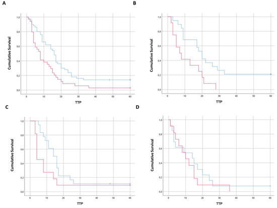 Prognostic impact of CTC on time to progression (TTP). Panel (A): Comparison in TTP between CTC-positive vs. CTC-negative samples (all mCRC pts). Panel (B): Comparison in TTP between CTC-positive vs. CTC-negative samples in left colon cancer pts (p = 0.009). Panel (C): Comparison in TTP between CTC-positive vs. CTC-negative samples in rectal cancer pts (p = 0.058). Panel (D): Comparison in TTP between CTC-positive vs. CTC-negative samples in right colon cancer pts (p = 0.5).