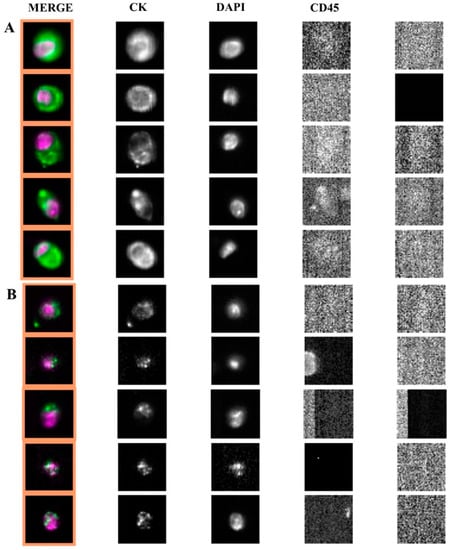 From each patient, 7.5 mL of peripheral blood was collected in CellSave preservative tube (Menarini Silicon Biosystems) containing EDTA and a cell fixative, maintained at room temperature and processed within 72 h. The CTC enumeration was carried out through the CellSearch® system, employing CellSearch® Epithelial Cell Kit, which contains a ferrofluid-based capture reagent and immunofluorescent staining reagents. Briefly, CTC were first enriched from 7.5 mL of whole blood by anti-EpCAM-antibody-coated ferrofluid reagent and subsequently stained for cytokeratins (CK), 4’-6-Diamidino-2-phenylindole (DAPI), and CD45. An event was classified as CTC when exhibiting the phenotype EpCAM+, CK+, DAPI+, and CD45-. Apoptotic CTC were defined as all EpCAM+/CK+/CD45-cells characterized by altered morphological parameters such as speckled pattern of keratin staining and/or fragmented or disintegrated nuclei [10].