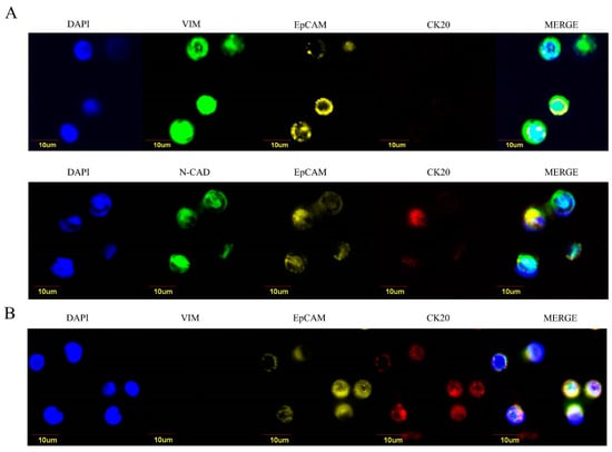 Epithelial-like and mesenchymal-like CTC isolated from left-sided (panel A) and right-sided (panel B) colorectal cancers. Panel A: Epithelial-like CTC analyzed by immunofluorescence for EpCAM (yellow), cytokeratin 20 (CK20, red), and vimentin/N-cadherin (VIM/N-CAD, green). In blue, nuclei are visualized. Original magnification 60×. Panel B. mesenchymal-like CTC analyzed by immunofluorescence for EpCAM (yellow), cytokeratin 20 (CK20, red), and vimentin (VIM, green). In blue, nuclei are visualized.