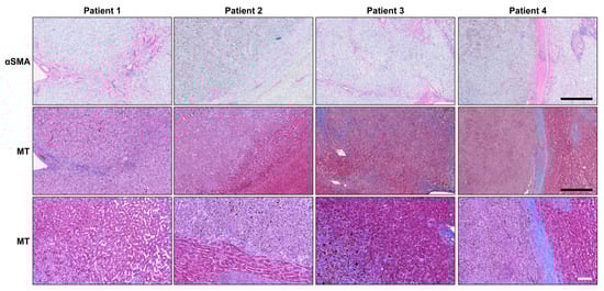 Activated HSteCs were recruited by both micro- (<50 µm, top panels) and macro-metastases (>500 µm, bottom panels; Figure 3B and Figure 4). They produced fibrillar collagen in the vicinity of UM malignant lesions in all co-inoculation groups similarly to human samples (Figure 1), as well as in mice injected only with the TJU-UM001 cells (Figure 3B and Figure 4). In the latter instance, αSMA-positive cells surrounding UM metastases most likely correspond to endogenous murine HSteCs. Next, hepatic metastases were localized and count in all groups using MT-stained slides (Figure 3C). The co-inoculation of TJU-UM001 with human HSteCs led to an increase in the number of hepatic metastases regardless of the ratio (p = 0.0033).