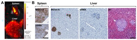 Establishment of a mouse xenograft model of metastatic UM to assess the recruitment of HSteCs. (A) Ex vivo fluorescence imaging of the liver and spleen of a triple-immunodeficient mouse bearing UM metastases generated with the TJU-UM001 cell line co-inoculated with human HSteCs. The color scale indicates the intensity of the fluorescence recorded 6 weeks post-inoculation, where the yellow signal corresponds to the highest concentration of UM cells. (B) Immunohistological analyses of UM-derived liver metastases using the Melan-A antibody to identify melanoma malignant lesions, and the αSMA antibody to label activated stellate cells; the positive signal appears in brown. The Masson’s Trichrome (MT) stain reveals the presence of collagen in blue. Scale bars, 100 µm.