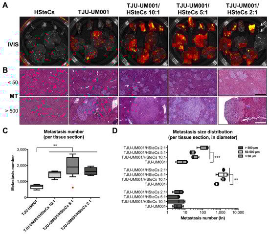 We also analyzed the size in diameter of the metastases, to see if the ratios of HSteCs impacted their distribution between micro-and macro-metastases (Figure 3D). Once again, the co-inoculation of TJU-UM001 cells with human HSteCs increased significantly the number of micro-metastases (<50 µm; p = 0.0007) and metastases between 50–500 µm (p = 0.0054), even at the 10:1 ratio. These results confirmed the early role of stellate cells in favoring the growth and invasion of UM cells in the liver.