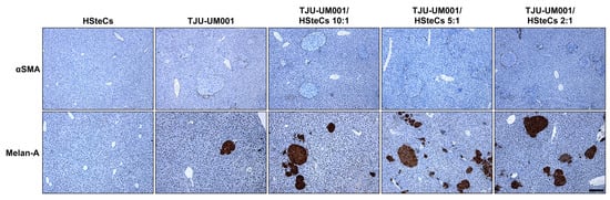 HSteCs are recruited early by metastatic UM cells. Immunohistological analyses of UM-derived liver metastases in triple-immunodeficient mice (N = 4 per condition) inoculated with the TJU-UM001 cell line alone or in combination with human HSteCs (ratios 10:1, 5:1 or 2:1). The αSMA antibody labels activated stellate cells recruited in the vicinity of UM cells, while the Melan-A antibody highlights UM malignant lesions; the positive signal appears in brown. Scale bar, 100 µm.