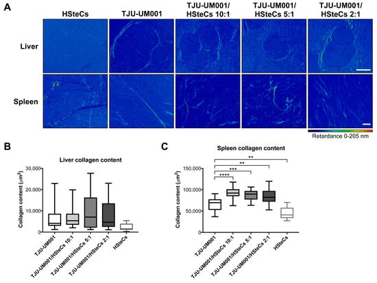 Human HSteCs accumulate fibrillar collagen when co-injected with metastatic UM cells. (A) QPOL imaging of the liver (top panels) and spleen (bottom panels) of triple-immunodeficient mice (N = 4 per condition) bearing UM metastases generated with the TJU-UM001 cell line inoculated alone or in combination with human HSteCs (ratios 10:1, 5:1 or 2:1). The dark blue to red signal corresponds to the collagen content (retardance scale) at 6 weeks post-inoculation. Scale bars, 100 µm. The collagen content in the liver (B) or spleen (C) expressed in µm2 for the five groups is represented as box-and-whisker plots, with the median indicated by the horizontal line. One-way ANOVA with Dunnett’s post hoc test, ** p < 0.01, *** p < 0.001 and **** p < 0.0001.