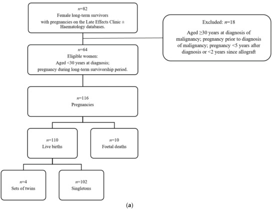 Within the general population, ‘peripartum cardiomyopathy’ (PPCM) is a rare condition with an estimated incidence of 1 in 3000 live births [11,12]. PPCM is typically a dilated cardiomyopathy, defined as heart failure during pregnancy (usually the last trimester) or ≤5 months postpartum [11,12]. However, there is limited data regarding the comparative cumulative incidences of pregnancy-related cardiac events in long-term survivors of malignancy. Furthermore, the risk factors for peripartum cardiac dysfunction in long-term survivors of malignancy are unknown.