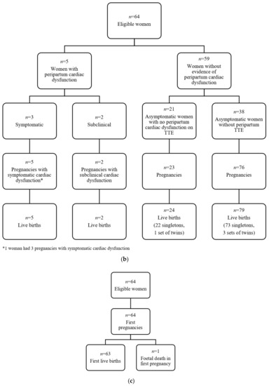 Of the 63 first live births, 20 (32%) had peripartum TTE and were included in the analyses for cardiac dysfunction (Table 3) (Figure 1c).