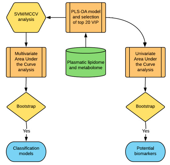 Statistical approach used for the identification of potential lipid and metabolite-based biomarkers for the prediction of the alloreactivity following stem cell transplantation (SCT). A supervised statistical approach in the form of partial least squares discriminant analysis (PLS-DA) was applied to the consolidated metabolomic and lipidomic data as a first step to find potential biomarkers and to detect the presence of class separation, if any, between graft vs. host disease (GVHD) and non-GVHD patients. The top 20 most important variables, which separates the groups, were selected by the variable importance in projection (VIP). A support vector machine (SVM) used these VIP variables to further find the binary classification of patients in the two groups. The result was cross-validated with Monte Carlo cross-validation (MCCV) and was used in a multivariate area under the curve of the receiver operating characteristic (AUCROC) analysis to select the best model based on low dimensionality and high accuracy. Model estimates were validated with bootstrap CI. The best model was used as reference to select potential biomarkers of GVHD through univariate analysis of the top 20 VIP that passed the criteria of high AUCROC estimate and low t-test p-value, and validated with bootstrap CI.