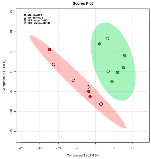 To estimate the potential of the lipids and metabolites to predispose SCT recipients to the development of alloreactivity in the form of either acute or chronic GVHD, post-conditioning and immediate pre-transplant plasma lipid and metabolite data were analyzed via PLS-DA. The degree of separation of patients with future GVHD against patients with no GVHD was visualized by the scores plot of the two principal components. The distance of class separation suggests that metabolic variation may correlate with the development of GVHD in patients undergoing SCT (Figure 2).