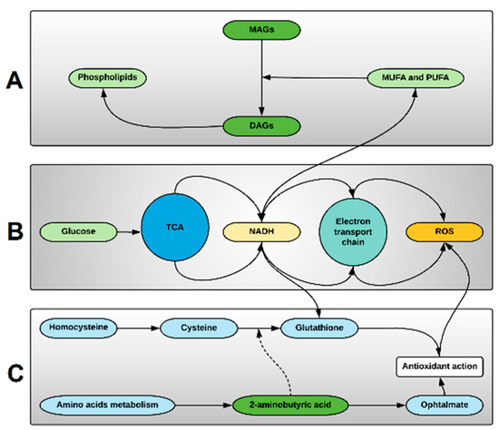 The more important lipids and metabolites associated with GVHD may indicate the main compensatory metabolic pathways modulated in hematopoietic cells pre-transplant. (A) Phospholipids metabolism are affected suggesting Phospholipase C activity to produce diacylglycerols (DAGs), and diacylglycerol lipase and monoacylglycerol lipase activity to produce monoacylglycerols (MAGs) and free fatty acids (FFA), respectively. Predominance of monounsaturated (MUFA) and polyunsaturated (PUFA) free fatty acids are result of increased fatty acyl-CoA desaturases activity, increasing the anticancer activity of ω-3 fatty acids. This metabolic pathway is linked to elevated levels of the reduced form of nicotinamide adenine dinucleotide (NADH), produced in the tri-carboxylic acid cycle (TCA), and important on desaturases activity. (B) Glucose uptake is increased due to increased energy demands in hematopoietic cells, and increased aerobic glycolysis with increased NADH, providing NADH for the electron transport chain and resulting in reactive oxygen species (ROS). (C) Oxidative stress compensation is achieved by activation of cysteine-glutathione pathway, and antioxidant action. Exacerbation of these mechanism leads to depletion of cysteine and glutathione, causing increased 2-aminobutyric acid-ophtalmate compensatory pathway activation originated from amino acids metabolism.