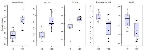 Comparison of five biomarkers of GVHD (YES) against no GVHD (NO). The comparative analysis revealed elevated 1-monopalmitin, DG (38:5), and DG (38:6) and decreased 2-aminobutyric acid and FA (20:1) in patients that will develop GVHD.
