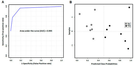 The evaluation of SVM model performance analyzed by AUROC shows the five specific biomarkers model appears to be accurate in predicting the future development of GVHD (AUC = 0.995) with patient’s day 0 plasma drawn pre-transplant (Figure 6A). The predictive power of class probability of the SVM method was also tested and the confusion matrix represented by the probability plot in Figure 6B shows the method is robust without any misclassification.